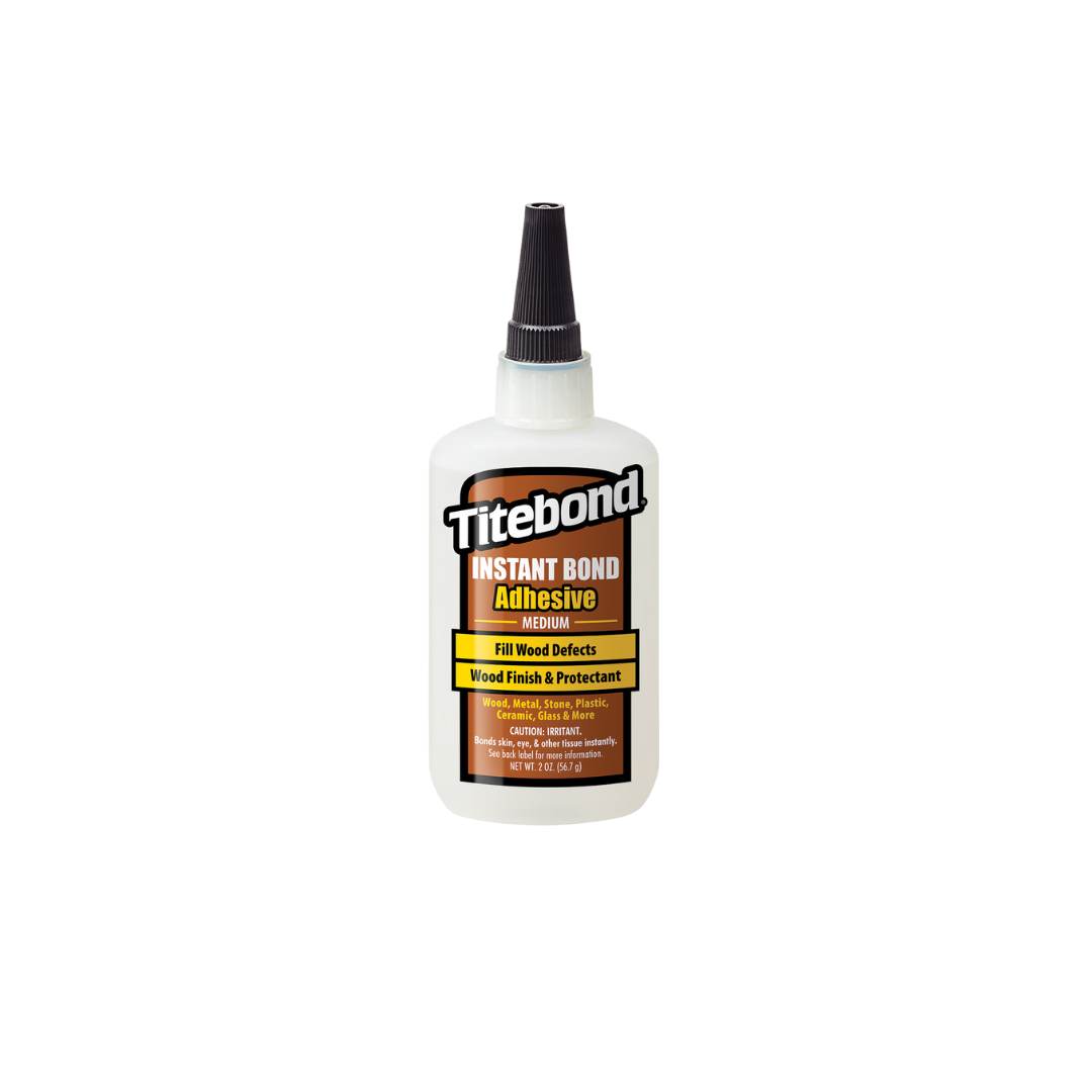 Titebond Instant Bond es un pegamento de Cianoacrilato basado en un sistema de dos componentes que tarda entre 5 a 15 segundos en fraguar y entre 30 a 60 segundos en el curado inicial.